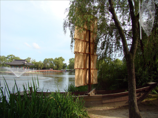 | ▲付与宮南池と白馬川辺に浮かべた黄布帆掛け船-2012.7.23 |
