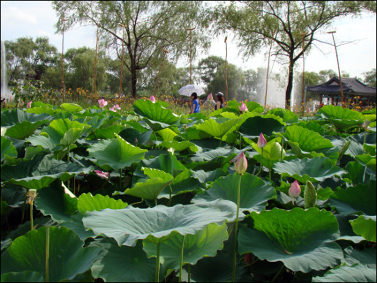 | ▲付与宮南池では毎年夏書童蓮華祭りが開かれる. 今年は 7.27‾7.29. しかし祭りが開かれる 10日前にもうぱっと咲いてしまったと言う. そのためか蓮華と峰がほとんどなかった. -2012.7.23 |